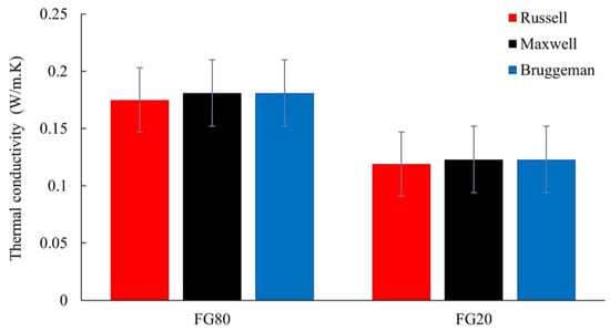 As presented in the materials and methods section, the non-fibrous composites are made from flaxseed-gum-filled epoxy resin. To determine the conductivity of the non-porous phase in the matrix λFG(s), three analytical models were selected: Russell, Maxwell, and Bruggeman [33,34]. These models were chosen based on their capability for estimating thermal conductivity for different shapes of pores within the composite material.