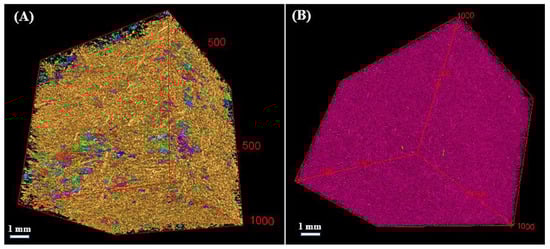 X-ray CT images of the segmented flax fibers from (A) the fibrous composite (FFG) and (B) the panel’s fibers (in air).
