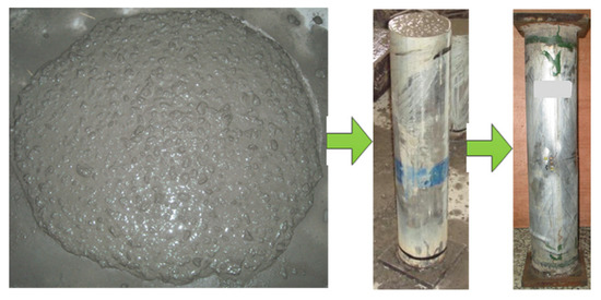 Two square endplates were welded on the columns’ ends. The thickness and side length of the square endplates were 20 mm and 180 mm, respectively. A square steel endplate was welded onto the bottom end of the columns before casting concrete, and it could function as a mold together with the steel tubes during the concrete casting process. The geometric center of the endplate and the steel tubes must remain in a vertical line to ensure the load can apply to the columns evenly. External vibration was not used during the whole casting process. The columns were cured in a laboratory with relative humidity and temperature of 95% and 20 °C, respectively, lasting for 28 d after casting the concrete. However, shrinkage about 2 mm was generated on the infill concrete after curing for 28 d. Therefore, high-strength cement paste was used to fill the uneven space generated by the concrete shrinkage. The top end was welded to another steel endplate before testing. Preparation for the SCCTST columns is shown in Figure 1.