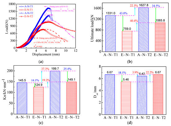 where and represent the ultimate load from experimental results and the displacement at 0.4, respectively. is the displacement at the ultimate load. Figure 4c,d display the comparison of the initial stiffness and between the columns withstand eccentric load and axial load, respectively. As shown in Figure 4c, in the comparison of the initial stiffness of the columns A–N–T1 and A–N–T2, the initial stiffness of E–N–T1 and E–N–T2 is correspondingly reduced by 14.1% and 25.4%, respectively. Moreover, the initial stiffness corresponding to axial load and eccentric load is increased by 37.3% and 19.3%, respectively, as the wall thickness factor decreases from 116.7 to 46.7.