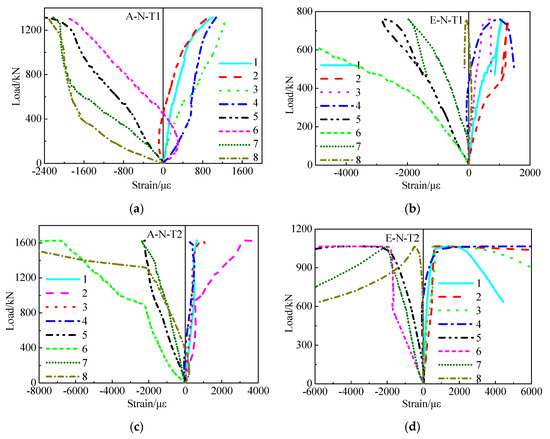 Relations between load and strain. (a) Relations between load and strain of A–N–T1. (b) Relations between load and strain of E–N–T1. (c) Relations between load and strain of A–N–T2. (d) Relations between load and strain of E–N–T2.