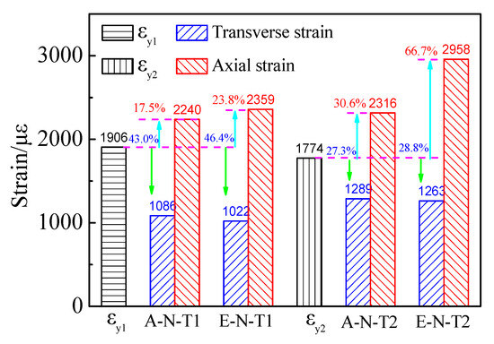 The average εue in the axial and transverse directions is correspondingly larger and smaller than that of the yield strain. This indicated that the confinement in the transverse direction is weak under the ultimate load. The average εue of the column A–N–T1 at the axial and the transverse directions is −2240 με and 1086 με, respectively. Compared with εy1, the average εue of A–N–T1 at axial and transverse directions is correspondingly increased by 17.5% and decreased by 43.0%, respectively. Additionally, the average εue of the column E–N–T1 at the axial and the transverse directions is −2359 με and 1022 με, respectively. Similarly, compared with the yield strain εy1, the average εue of E–N–T1 at axial and transverse directions is correspondingly increased by 23.8% and decreased by 46.4%, respectively. The average εue of the column A–N–T2 at the axial and the transverse directions is −2316 με and 1089 με, respectively. Compared with the yield strain εy2, the average εue of A–N–T2 at axial and transverse directions is correspondingly increased by 30.6% and decreased by 27.3%, respectively. The average εue of the column E–N–T2 at the axial and the transverse directions is −2958 με and 1263 με, respectively. Compared with the yield strain εy2, the average εue of E–N–T2 at axial and transverse directions is correspondingly increased by 66.7% and decreased by 28.8%, respectively.
