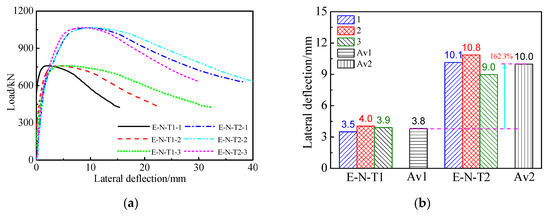 Figure 7 displays the relations between load and lateral deflection of the SCCTST columns subject to eccentric load. Figure 7 describes that the lateral deflection of E–N–T1 and E–N–T2 almost increases linearly when the load increases at 70% of the ultimate load. And then, the growth rate of the lateral deflections is more quickly than that of the load, and the lateral deflection is increased nonlinearly with the load. The lateral deflection is gradually decreased with continued loading after the ultimate load. As the wall thickness factor decreases from 116.7 to 46.7, the load–lateral deflection curves of the descending branch are more gentlely. Av1 and Av2 represent the average lateral deflections withstanding the maximum load of E–N–T1 and E–N–T2, respectively. The average lateral deflection fue withstanding the maximum load of E–N–T1 and E–N–T2 is 3.8 mm and 10.0 mm, respectively. The average lateral deflection fue of E–N–T2 is increased by 162.3% compared with that of E–N–T1.