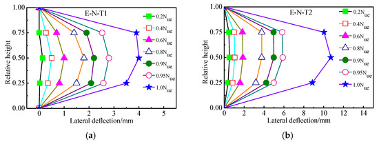 Figure 8 describes the relations between load and lateral deflection with different relative height of the columns subject to eccentric load. It can be seen from Figure 8 that the lateral deflection along the column height is almost symmetrical at different loading levels. Moreover, the symmetry of the lateral deflection of E–N–T2 at different loading levels is more evident compared with that of E–N–T1, as shown in Figure 8b. It is indicated that the symmetry of the lateral deflection along the column height is more evident with increase of the wall thickness. This phenomenon indicates that the confinement and the force state will be improved with thicker wall thickness.