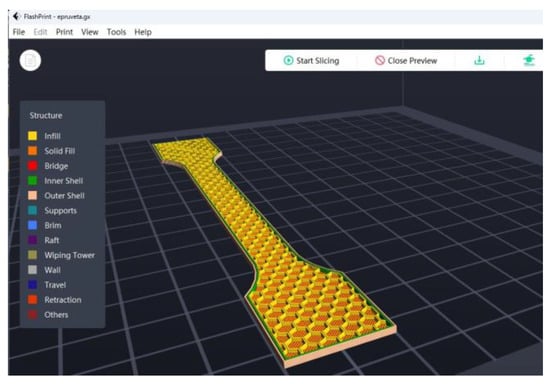 After configuring all the parameters in the FlashPrint5 software’s slicer (Table 3), the G-code was generated and transferred to the 3D-printer-controlled computer. Subsequently, all the tensile test specimens were printed using the Adventurer 4 Series 3D printer.