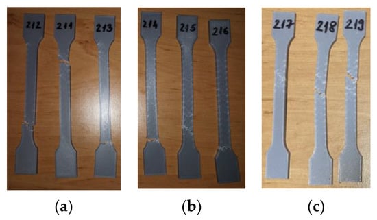 The tensile test data for all 3D-printed PLA specimens are shown in Table 6. The data are organized into three distinct groups: (1) data pertaining to tested 3D-printed PLA specimens that were not exposed to mineral engine oil (PLA_211, PLA_212, and PLA_213)—Case 1, (2) data concerning tested 3D-printed PLA specimens that were exposed to mineral oil for 7 days (PLA_214, PLA_215, and PLA_216)—Case 2, and (3) data relating to tested 3D-printed PLA specimens that were exposed to mineral oil for 30 days (PLA_217, PLA_218, and PLA_219)—Case 3.