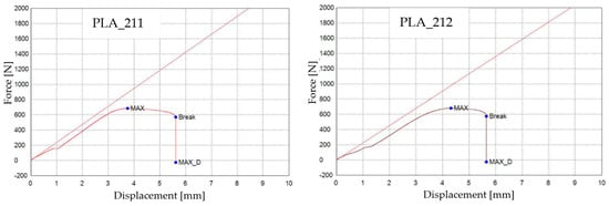 Based on the analysis of the graphs in Figure 5, it is evident that the 3D-printed PLA_214, PLA_215, and PLA_216 specimens (Case 2) demonstrated a notable increase in displacement (approximately up to 9 mm) when compared to the 3D-printed PLA specimens that were not exposed to mineral engine oil (PLA_211, PLA_212, and PLA_213).