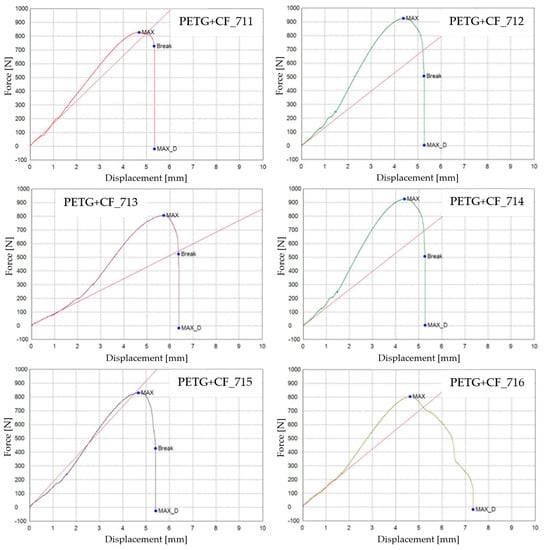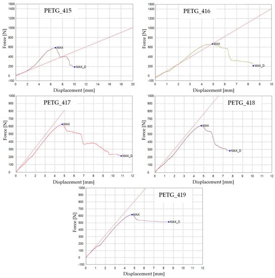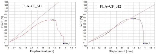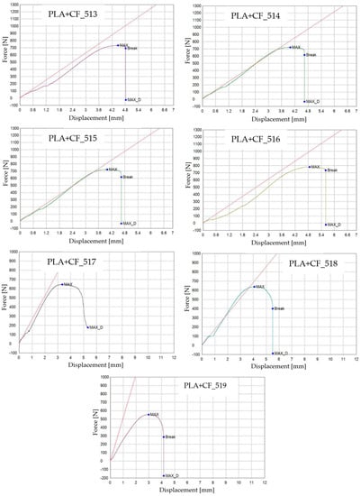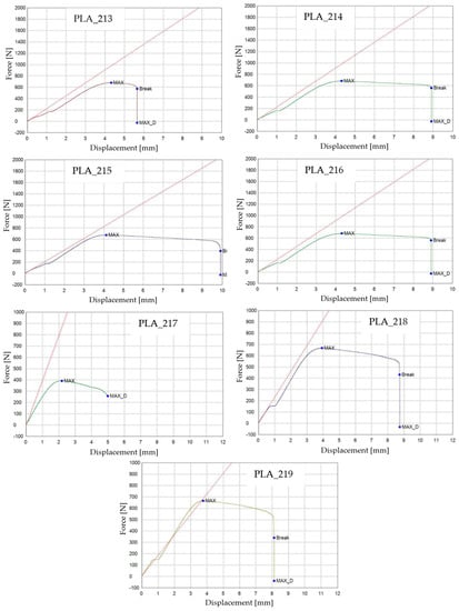 3D-printed PLA specimens tested: the force–displacement curves.
