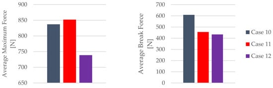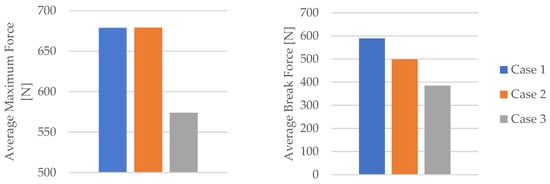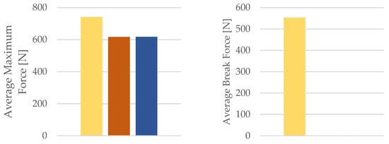 Average maximum force and average break force of the 3D-printed PLA specimens tested.