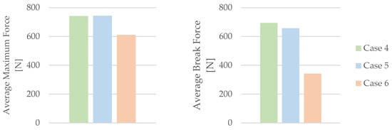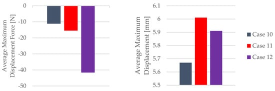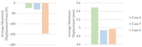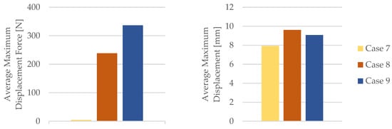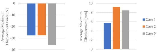 The impact of mineral engine oil on the behavior of the 3D-printed PLA specimens is evident in both the average maximum force and the average breaking force, as depicted in Figure 6, as well as the average maximum displacement force and average maximum displacement, as illustrated in Figure 7.
