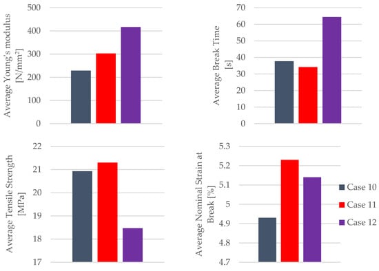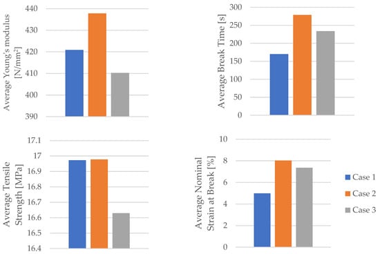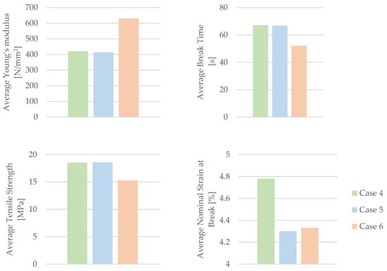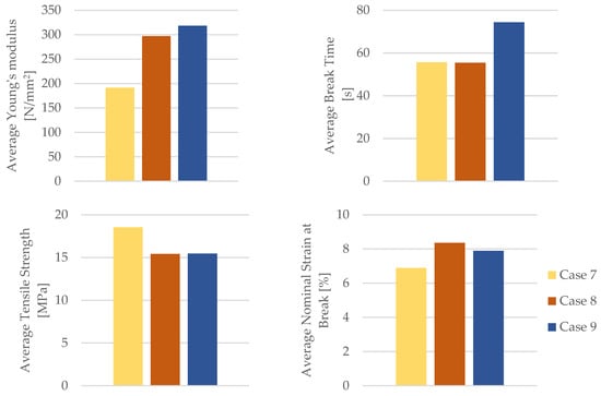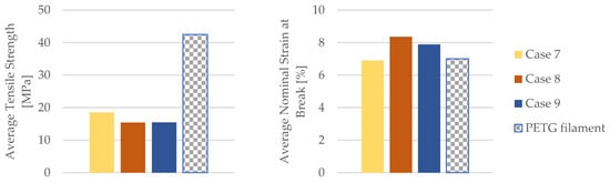 Using the data obtained from the tensile test in Table 6 as well as Equations (1) and (2), the mechanical parameters (tensile strength, nominal strain at the break) of the PLA tensile test specimens were calculated. Table 7 and Figure 8 display the corresponding average tensile strength and average nominal strain at the break. The average Young’s modulus and average time of the break shown in Table 7 and Figure 8 were recorded during the test.