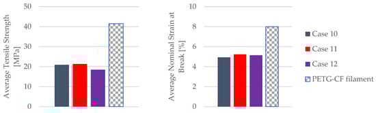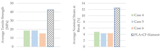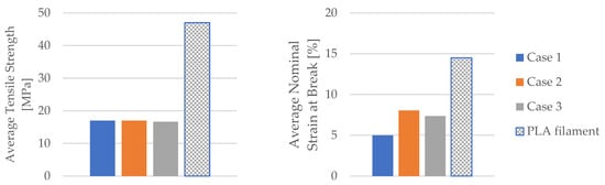 The displayed mechanical parameters of the tested 3D-printed PLA specimens in Figure 9 (average tensile strength and average nominal strain at the break) refer to the specimens with 30% infill. The manufacturer of the filaments used in this study provided the mechanical parameters of the PLA filament for a 100% infill (Table 2). Figure 9 shows a comparison between the obtained mechanical parameters of the tested 3D-printed PLA specimens and the mechanical parameters specified by the manufacturer of the PLA filament used.