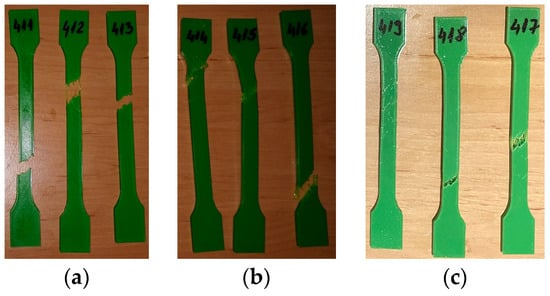 The 3D-printed PLA tensile-testing specimens after the tensile testing are presented in Figure 4.