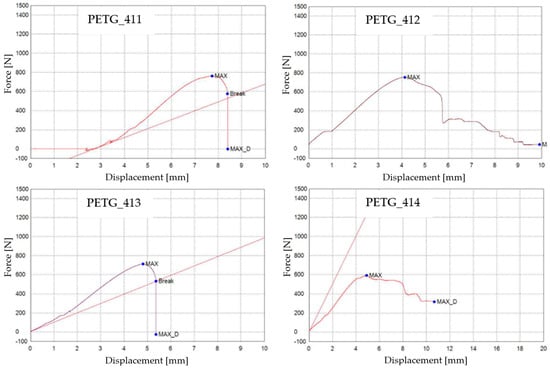 The graphical representations of the maximum force, breaking force, and maximum displacement force for individual PLA specimens are shown in Figure 5.