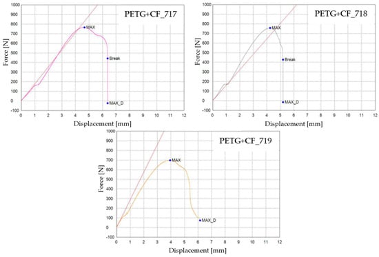 The tensile test data for all 3D-printed PLA+CF specimens tested are shown in Table 8. The data are organized into three distinct groups: (1) data pertaining to tested 3D-printed PLA+CF specimens that were not exposed to mineral engine oil (PLA+CF_511, PLA+CF_512, and PLA+CF_513)—Case 4, (2) data concerning tested 3D-printed PLA+CF specimens that were exposed to mineral oil for a duration of 7 days (PLA+CF_514, PLA+CF_515, and PLA+CF_516)—Case 5, and (3) data relating to tested 3D-printed PLA+CF specimens that were exposed to mineral engine oil for a period of 30 days (PLA+CF_517, PLA+CF_518, and PLA+CF_519)—Case 6.