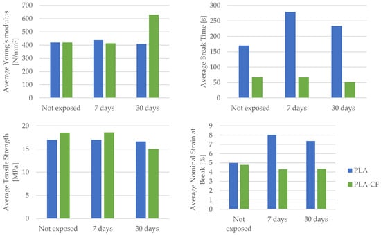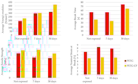 PETG+CF samples exhibited similar trends, initially showing an increased tensile strength (by 1.78%) and nominal strain at the break (by 6.08%) after 7 days of exposure. However, prolonged exposure (after 30 days) led to a reduction in tensile strength (by 11.75%).