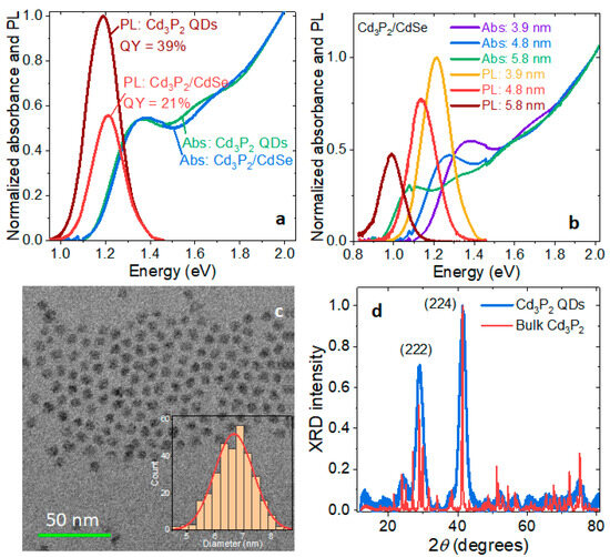 A typical batch of oleate-capped Cd3P2 QDs showed an emission peak at 1.19 eV with the full width at half-maximum (fwhm) of 170 meV and a PL QY of 39% (Figure 1a). The powder XRD pattern of these Cd3P2 QDs showed two strong peaks corresponding to the (222) and (224) families of planes of the tetragonal crystal structure (Figure 1d). These QDs were stable under dry nitrogen but degraded in air over two days. The treatment with CdSe resulted in a slight blue shift of the PL to 1.21 eV with the fwhm of 164 meV, a decrease in the PL QY to 21%, and a prolonged stability of the QDs under ambient conditions. The small blue shift in the absorption and PL spectra is a result of a gentle etching of Cd3P2 with oleylamine during the treatment with Se [21]. Larger Cd3P2/CdSe QDs showed lower PL QYs (16% and 8.4%, Figure 1b), which is consistent with the previously reported results for other near-IR emitters [7,22]. The reduction in the PL QY comes from the lattice mismatch between the tetragonal Cd3P2 and zincblende CdSe crystal structures. Core-shell Cd3P2 were noticeably larger than the parent Cd3P2 QDs in TEM (e.g., 6.7 nm vs. 5.8 nm; Figure 1c), which, together with ICP measurements (Table S1), confirmed the growth of a CdSe shell. Larger Cd3P2/CdSe QDs appeared faceted in TEM (Figure 1c), consistent with previous reports [13] and in accord with the tetragonal crystal structure. Cd3P2 QDs synthesized from CdI2 were smaller in size, with their PL peak not exceeding 900 nm.