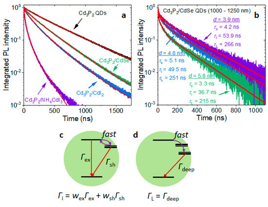 PL dynamics of bare and passivated Cd3P2 QDs. (a) Time-resolved PL of Cd3P2, Cd3P2/CdSe, Cd3P2/CdI2, and Cd3P2/NH4CdI3 QDs excited with a 629 nm pulsed laser diode and emitting ca. 850 nm, fitted with the minimal number of multiexponentials. (b) Time-resolved PL of Cd3P2/CdSe QDs excited with a 705 nm laser with the emission peaks at 1000–1250 nm (the QDs shown in Figure 1b). (c) In Cd3P2 QDs with only shallow traps, the excitation is delocalized between the band edge and trap states. (d) In Cd3P2 QDs with deep traps, the excitation localizes in a trap state.