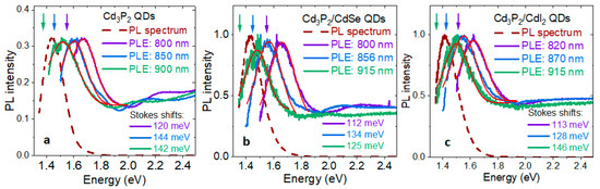 Photoluminescence excitation (PLE) spectra of (a) oleate-capped Cd3P2 QDs, (b) Cd3P2/CdSe QDs, and (c) Cd3P2/CdI2 QDs, emitting ca. 850 nm. The arrows point to the monitored emission energies within the PL band of each sample.