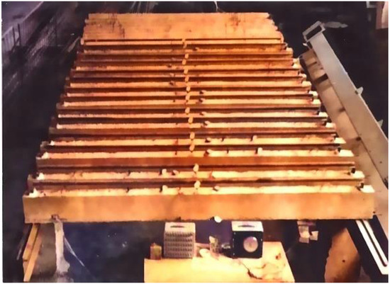 For the production of experimental specimens, rigid steel molds were used. Two strands were tensioned on each power form in sequence, and on each strand, two twin specimens were fabricated. The tensioning of the reinforcement was carried out using a hydraulic jack DP-30-200 (Moscow, Russia) with a manual pumping station drive. The magnitude of the force in the reinforcement during tensioning was monitored using a pressure gauge and by measuring the deformations of the reinforcement.