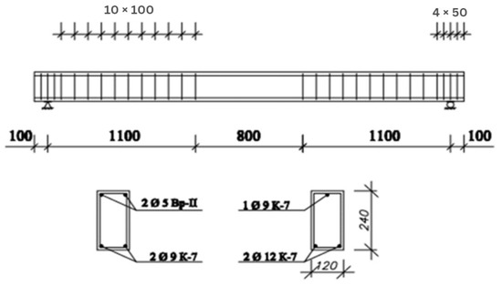 To conduct the experimental investigations, a testing program was developed, according to which the reinforced concrete beams were divided into three groups based on the types of concrete, reinforcement, and precompression level. The experimental beams were subjected to external static loads through two concentrated forces positioned at a distance of 110 cm from the support on both sides.
