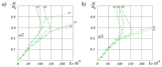 Figure 4 illustrates the deformations of strain gauges attached to the lower surface of the beam, which are most sensitive to crack formation. As seen in the figure, long before the formation of cracks, the deformations occur uniformly. As the load increases, the uniformity is disrupted due to the plastic deformation of the concrete, and the readings of the strain gauge located on the surface of future cracks increase more intensively. At this stage, visible cracks had not yet been detected.