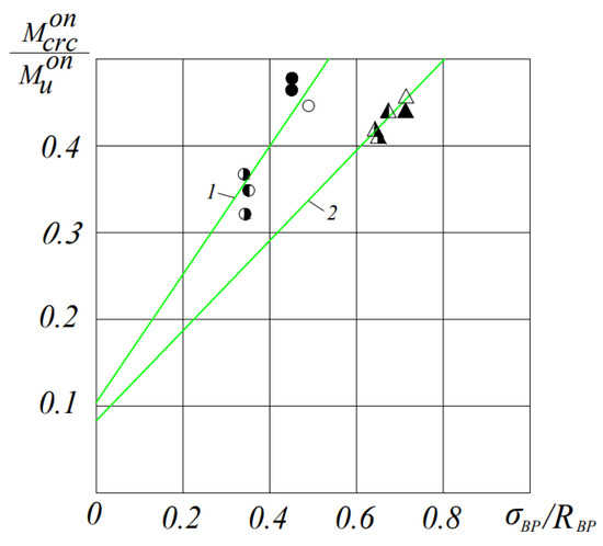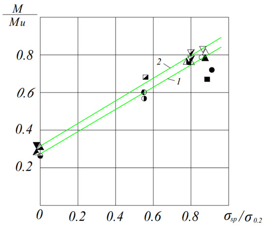 Dependence of the ratio M/Mu on the stress σsp/σ0.2 for a crack opening width of = 0.15 mm: 1—beams of ceramporite concrete; 2—heavy concrete beams. ⚫-BL19V-1, ○-BLP9V-1,2, ◐-BL19C-1,2, ◑-BLP9C-1,2, ◒-BLP9O-1,2, ■-BT9V-1,2, ◪-BT9C-1,2, △-BLP12B-1,2, ▲-BL112B-1,2, ◭-BL112C-1,2, ◮-BLP12C-1,2, ⧩-BT12C-1,2, ▽-BT12B-1,2 and ⧨-BLP12O-1,2.
