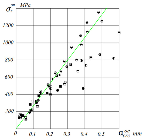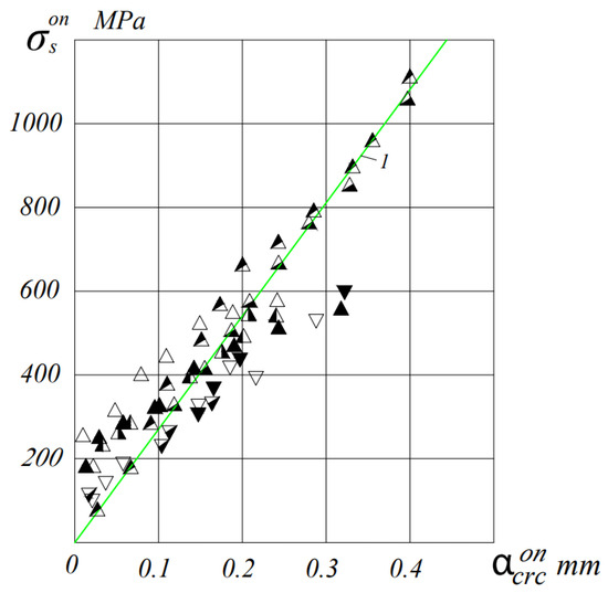 Figure 6 and Figure 7 show the results of measurements of the crack opening width depending on the stresses (in prestressed beams—the increment of stresses from the action of an external load) in the reinforcement of the tension zone.