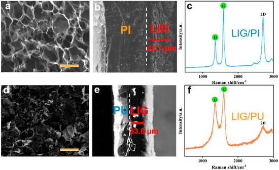 SEM images and Raman spectra of LIG/PI and LIG/PU samples. (a) SEM image of LIG/PI surface morphology (Scalar bar is 5 μm). (b) SEM image of LIG/PI cross-section. (c) Raman spectra of LIG/PI. (d) SEM image of LIG/PU surface morphology (Scalar bar is 20 μm). (e) SEM image of LIG/PU cross-section. (f) Raman spectra of LIG/PU.