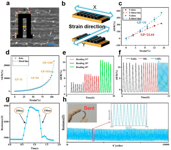 As one of the key structures of electronic skin [1], flexible sensors are equivalent to the receptors on the surface of human skin, which are widely used in the fields of soft robotics, biomedicine, and micro-wearable devices. Researchers have developed many types of flexible sensors to meet the application requirements in these fields. Wan et al. [2] developed an artificial synaptic thin-film transistor built on an ultra-thin flexible substrate based on high-carrier mobility semiconductor single-wall carbon nanotubes. The neuroelectronic skin closely mimics the behavior of actual human skin and can detect force stimuli in real time and provide behavior similar to biological synapses to transmit stimulus signals to the next stage. With the development of virtual reality technology and human–computer interaction technology, sensors with multifunctional application scenarios have attracted much attention. Qu et al. [3] developed a Ti3C2Tx-based strain sensor (GF = 19.1) in 2023 and used it for audio detection, human physiological signal monitoring, and facial expression recognition. To evaluate the performance of the proposed strain sensors, the gauge factor is adopted using the following formula: