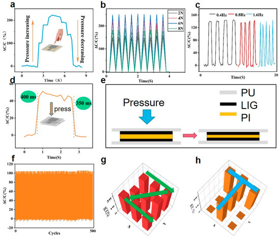 where ε is the dielectric constant of the PI film, S is the electrode area, and d is the distance between the two electrodes. Deformation caused by pressure on the PU film would result in a change in capacitance. Figure 5a shows the response of the relative capacitance change as a function of fingertip pressure, which indicates a good recoverable ability. The repeatability of the sensor under different pressures (2, 4, 6, 8 N) and frequencies (0.4, 0.8, 1.6 Hz) was then investigated, as shown in Figure 5b,c, respectively. The results demonstrated the good repeatability of the pressure sensor. The response time of the sensor was measured at 350 ms, as shown in Figure 5d. The cross-section diagram and working principle of the pressure sensor are shown in Figure 5e. Figure 5f depicts the relative capacitance change of the pressure sensor, demonstrating considerable consistency without obvious fatigue during 500 cycles. Photographs of the tactile sensor and the capacitive response of the 9 units of the pressure-sensing array are shown in Figure S6. We finally tested the respective performances of the tactile sensors when a finger slid along a “Z”- shaped path (Figure 5g), and placed a “T”-shaped mold (Figure 5h) on the sensing array. Real-time pressure distributions were successfully obtained, which demonstrated effective feedback.