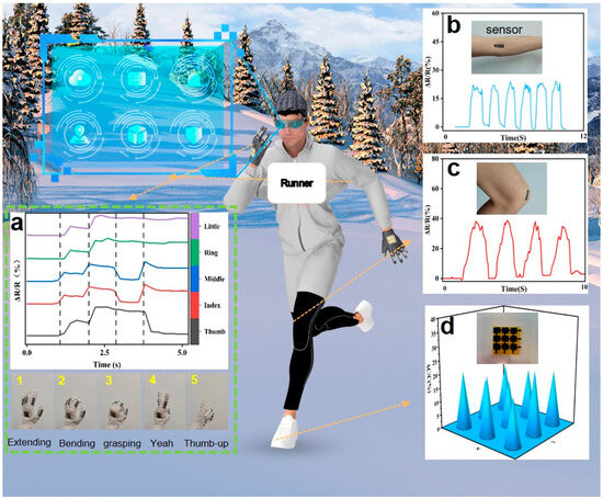 Integrating flexible sensors based on LIG/PU allows us to monitor human motion status comprehensively. The DM3058 digital multimeter can measure changing electrical parameters in real time and store the data. Thus, we can get the dynamic data of the measurement by connecting the sensor to the device. We attached five strain sensors to five fingers, respectively, which could effectively monitor the changes in human gestures, as shown in Figure 6a. The resistance-response curves of the five strain sensors were different under various gestures. According to the relative resistance of different sensors, gesture recognition was realized. This device can be combined with augmented reality (AR) glasses to control virtual interfaces with gestures in the future. By attaching sensors to the elbow and knee joints of the human body, changes in posture during sports such as running can be monitored. Figure 6b,c shows the measurement results. The responding signal strength increases with an increase in bending angle, showing a stable and repeatable responding signal. Flexible pressure sensors based on LIG/PU can be used for tactile feedback. Attaching a 3 × 3 sensor array to the sole of a human foot allows the pressure distribution in motion to be monitored. Figure 6d shows the relative capacitance distribution of the tactile sensor array. The LIG/PU sensor shows good stability and repeatability in all of the above signal monitoring.