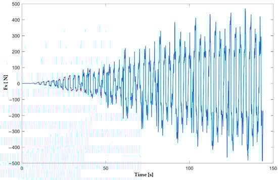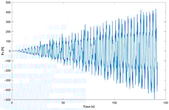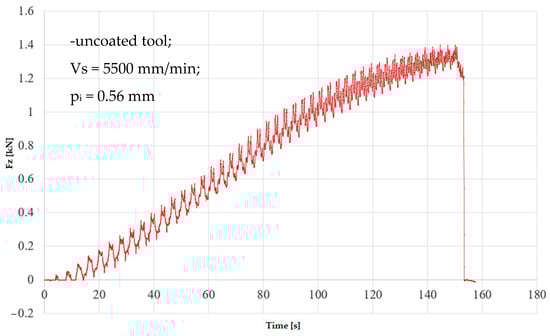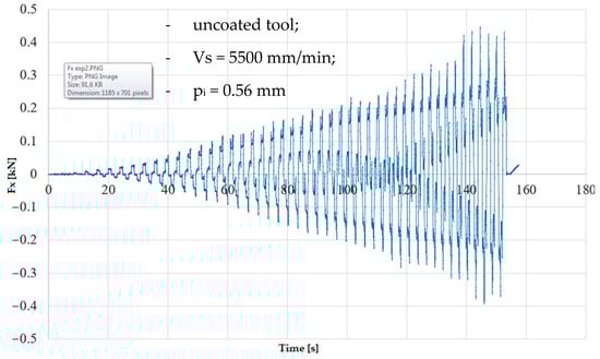 In Figure 11 and Figure 12, the variation in the force components Fz and Fx along the direction of the three XYZ coordinate axes for experiment 6 (case 2 of the coated tool) is plotted. Thus, the maximum values of the forces are as follows: Fz reaches the maximum value of 1.38 kN, and Fx reaches the maximum value of 0.42 kN.