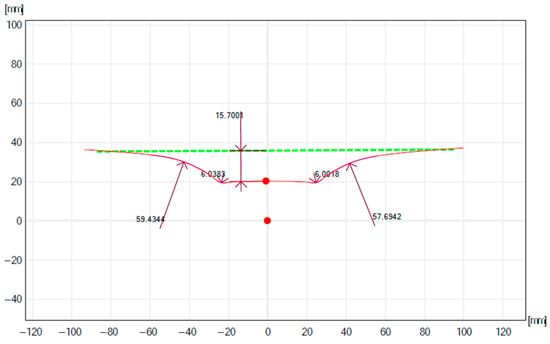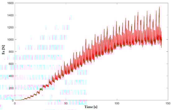 In Figure 9 and Figure 10, the variation in the components Fz and Fx along the direction of the two coordinate axes XZ in experiment 2 is shown graphically. The forming time was 157.4 s; this was lower because the incremental step was double, and the number of passes was lower. The maximum forming force Fz obtained in experiment 2 is 1.39 kN; the maximum value obtained for the Fx force is 0.38 kN.