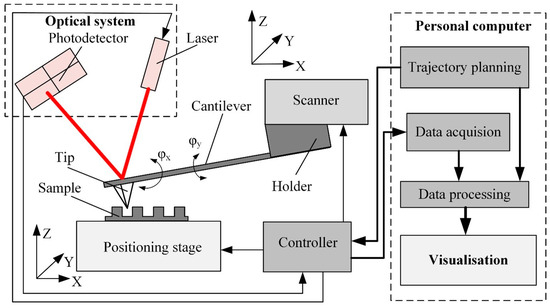 Typically, AFM consists of a few functional blocks: a positioning stage, a cantilever, a scanner, a controller, data processing, and visualization algorithms (Figure 1). The positioning stage ensures sample movement along three orthogonal axes; it consists of a set of precision drives and guides the positioning of the sample in the x, y, and z directions.