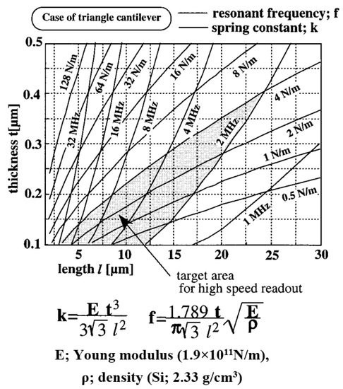 Research on the relationship between geometric parameters and the stiffness of the triangular cantilever in the literal, standard, and longitudinal directions was performed [63,64]. The researchers defined these dependencies as mathematical equations and proposed a mathematical model that allows the determination of the cantilever’s optimal thickness using experimental resonant frequency measurement results. The results suggest that short, rigid, triangular cantilevers are best suited for high-speed imaging.