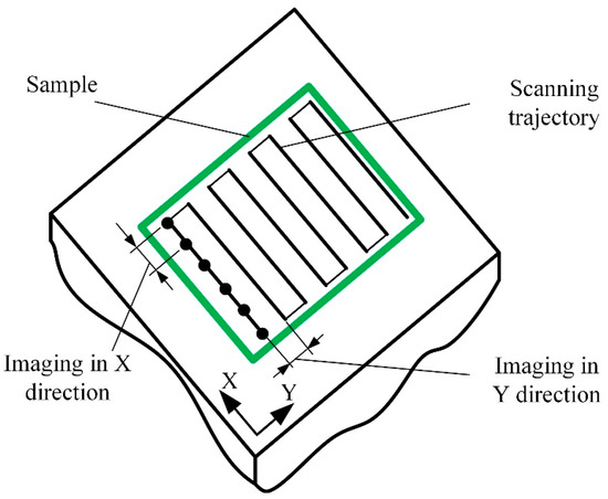 Before imaging, a few scanning parameters must be chosen: the size of the field of view, the scanning mode and speed, and the number of lines and points in each line. All these parameters will affect the overall image acquisition duration and future image resolution (Figure 3). The most popular imaging strategy is to start from a sparse, large field-of-view image, possibly interpolated by AI-enabled algorithms [17]. After that, the smaller region of interest is selected for high-resolution imaging (Figure 4). The software creates the image from sampled data points using various filters and interpolation algorithms [18]. Reconstruction-based imaging techniques and “Compressive sensing” theory can be used to minimize the number of required data points and, at the same time, to ensure a high resolution of the final image [19].