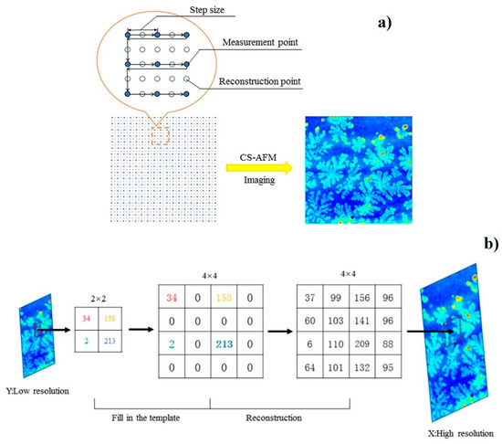(a) Super-resolution AFM imaging using compressed sensing (CS). (b) Super-resolution imaging schematic based on compressed sensing. Adapted from [17].