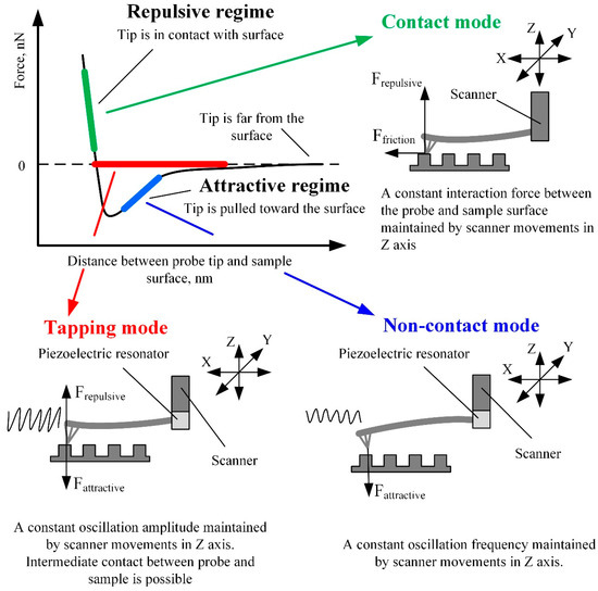 Depending on the interaction between the probe and the sample surface, three main AFM operating modes can be distinguished: contact mode, noncontact mode, and dynamic contact (tapping) mode [23,24]. The Van der Waals force mainly characterizes the probe and sample surface interaction. The intensity and direction of this force strongly depend on the distance between the probe and the sample surface (Figure 5).