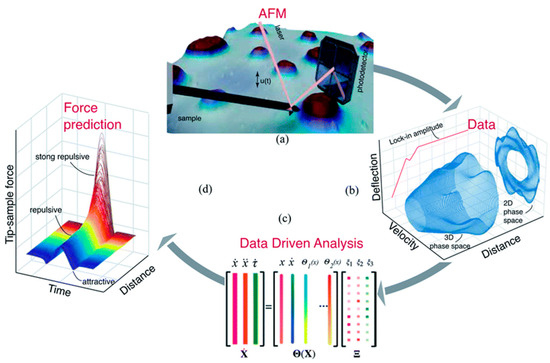 Schematic of the identification process. (a) Experimental data are obtained directly from the photodetector of the AFM. (b) The data are captured using a field programmable gated array device and post-processed to create state vector channels. (c) The state vectors are used as inputs in the sparse identification algorithm to discover the governing model of the system. (d) The data-driven model is used to estimate the tip–sample interaction force. Reproduced from Ref. [36] with permission from the Royal Society of Chemistry.