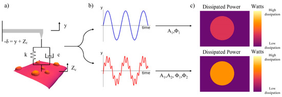 System schematic. (a) Cantilever–sample interaction: y is the cantilever position, Zc is the average distance between the tip and the sample, δ is the tip–sample gap/indentation, k is the tip–sample stiffness, and c is the tip–sample damping. (b) Cantilever position versus time for single/tapping mode and bimodal mode AFM. (c) Dissipated power images of single/tapping mode and bimodal mode AFM. Adapted from [38].