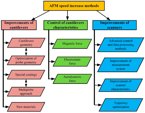 In the next sub-sections, we will focus on the cantilever properties, in situ cantilever characteristic adjustments, and AFM software improvements as mostly cost-effective and highly available methods, skipping the review of radical hardware engineering approaches, such as multiprobe designs [41,42] and cantilever-free AFMs [43], since reviewing these trends would overextend the scope of the present article.