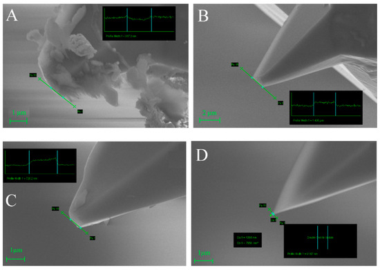 SEM images of AFM tips with radii of (A) 1745 nm, (B) 1406 nm, (C) 728 nm, and (D) 53 nm. Adapted from [22].