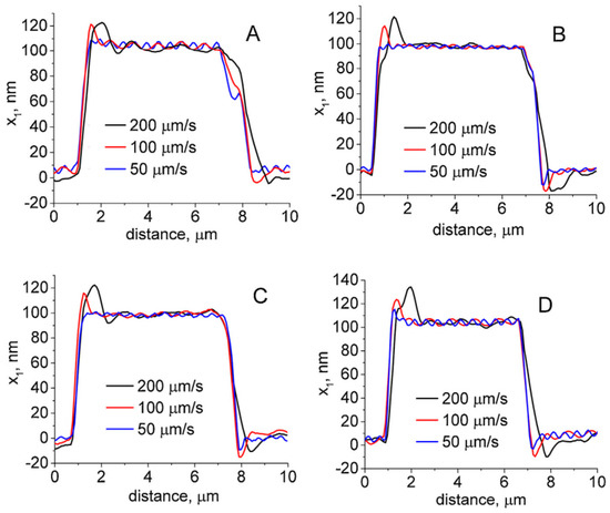Experiments with differently worn tips were performed in [22] (Figure 9). The authors also developed a mathematical model to determine the quality of the picture before scanning when some parameters, such as scanning speed, the material of the sample, and tip quality, are known. Experiments with the calibration grid revealed that a contaminated tip creates adhesion artifacts (Figure 9A and Figure 10A at distances from 7 to 8 µm). A similar tip geometry without contamination shows less adhesion (Figure 9B and Figure 10B). At distances from 1 to 2 µm, the artifacts that depend on scanning speed could be seen (Figure 10A–D).