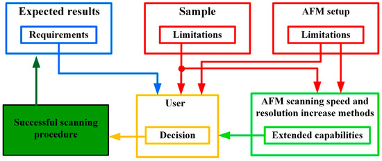According to the information gathered in the present review, we produced a graphical algorithm of the parametrization of AFM by sample properties and cantilever parameters optimized for improved performance, as illustrated in Figure 11. The graph shows the existing choice tree with a proper solution as output for available initial parameters. The essential input parameters are separated into three parts: the expected results define the requirements for AFM hardware and software; the sample determines the proper scanning mode, influencing AFM parameters; and the AFM setup, including cantilever choice, loops back to the possible quality of the expected image. To avoid the looping process in the user choice procedure, we use restraints in the form of requirements and limitations. Unfortunately, the existing analysis considers no universal methods for AFM parameters nor cantilever characteristics for any current sample. Even with a powerful way of controlling AFM characteristics, the ability to obtain an image within a reasonable time and of good quality with the required resolution and accuracy of a particular sample still depends on the user. Improving the AFM hardware and software of industrially made devices is tricky, as research on technology improvements is usually carried out on AFM setups, which are made in-house and are hardly accepted by the industry.