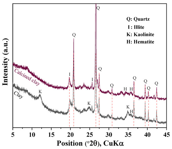 Ordinary Portland cement of ASTM type I (ASTM C150) was obtained from Sung Shin Cement [23], Republic of Korea. Hwangtoh is a clay mineral widely distributed in Korea. It contains high levels of calcium potassium chloride and calcium. Clay was ground before calcination, and calcined clay was produced by calcining hwangtoh clay at 800 °C for 60 min [6]. Figure 1 shows the XRD analysis results of clay before and after calcination. We can see that the calcination eliminated the kaolinite peak (2θ = 12.37°) [6]. Limestone powder and granulated blast furnace slag were obtained from Daejung Chemical Co., Ltd. (Sinan, Republic of Korea) and Asia Cement Co., Ltd. (Seoul, Republic of Korea), respectively. Table 1 presents the chemical compositions of the cement, limestone, slag, and calcined clay. The standard deviation for the XRF analysis results in Table 1 is 0.01%. Calcined clay and slag have higher aluminum contents than cement, which can support a synergistic effect between the limestone and slag or calcined clay. Calcined clay presents a higher silicon content than cement, which can contribute to the production of secondary calcium silicate hydrate (CSH). The average particle sizes of the cement, slag, calcined clay, and limestone were 18.3 µm, 12.8 µm, 12.3 µm, and 7.4 µm, respectively.