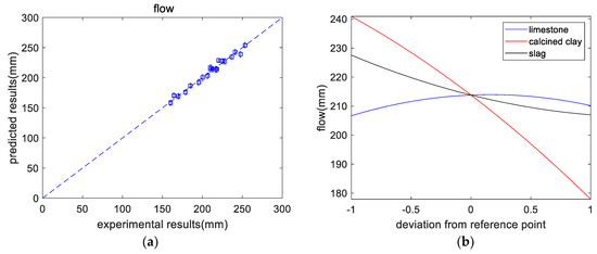 where , , and denote the contents of limestone, calcined clay, and slag, respectively. The predictions of flow agreed with the experimental results. Figure 3b shows the impact of each component on flow. Limestone has a negligible effect on flow. With increasing slag content, the flow rate decreases slightly. This is because of the higher surface area of slag than cement. However, as the content of calcined clay increases, the flow decreases significantly. This is because of the higher aluminum content in calcined clay than in cement. A higher aluminum content makes the mixture prone to forming ettringite, which can lower the flow [28]. In addition, the high surface area and specific structure of calcined clays also contribute to a lower slump. Likewise, Lin et al. [6] found that the addition of calcined hwangtoh clay can significantly reduce the slump of concrete.