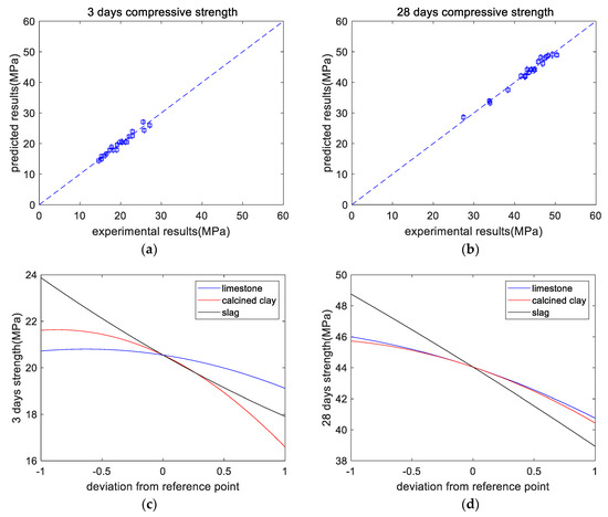 Results of compressive strength analysis. (a) Experimental versus predicted results of 3-day strength. (b) Experimental versus predicted results of 28-day strength. (c) Perturbations of variables of 3-day strength. (d) Perturbations of variables of 28-day strength. (e) Normalized 3-day strength. (f) Normalized 28-day strength.