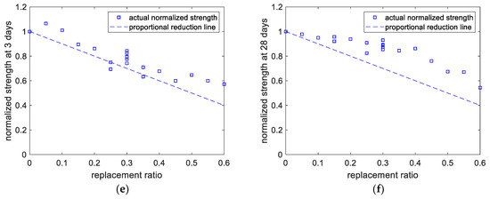 As shown in Figure 4c, at the curing age of 3 days, when the limestone content ranges from 0% to 5% (code changes from −1 to 0), the decrease in the strength is not significant. This is because limestone has a nucleation effect on cement hydration, can improve the hydration extent of cement, and can enhance the early-age strength of concrete. However, when the content of limestone powder further increases from 5% to 10% (code 0 to code +1), owing to the limestone’s dilution effect, the reduction in the strength becomes remarkable. In addition, as displayed in Figure 4d, at the age of 28 days, the strength decreases with increasing mineral admixture. This is due to the dilution effect and the lower reactivity of the mineral admixture compared with that of the cement. It should be noticed that in Figure 4d, the code +1 for limestone and calcined clay represents 10% and 20%, respectively. In other words, for limestone and calcined clay, when the x-axis represents the replacement ratio, the regression curves will be different. Figure 4e,f show the normalized strengths at the ages of 3 and 28 days, respectively. The paste’s normalized strength was calculated as the compressive strength ratio between hybrid paste and plain paste. The proportional reduction line corresponds to the dilution effect. At a curing age of 3 days, the normalized strength values are close to the dilution effect line, whereas, at the age of 28 days, they are much higher than the dilution effect line. This indicates the increasing reaction extent of the mineral admixtures from curing ages of 3 days to 28 days.