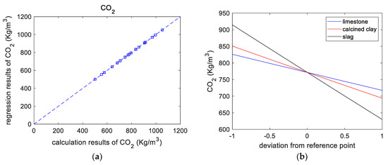 In the optimal design method shown in Section 4.2, the CO2 emission is based on each cubic meter of cement paste. In actual engineering, CO2 is often calculated based on each kilogram of binder. Based on the mix ratio and the CO2 emissions of binder components in Table 4, the CO2 emissions per kilogram of binder can be calculated (shown in Table 10). Moreover, the CO2 emission of 1 kg binder can be determined using a linear equation as follows: